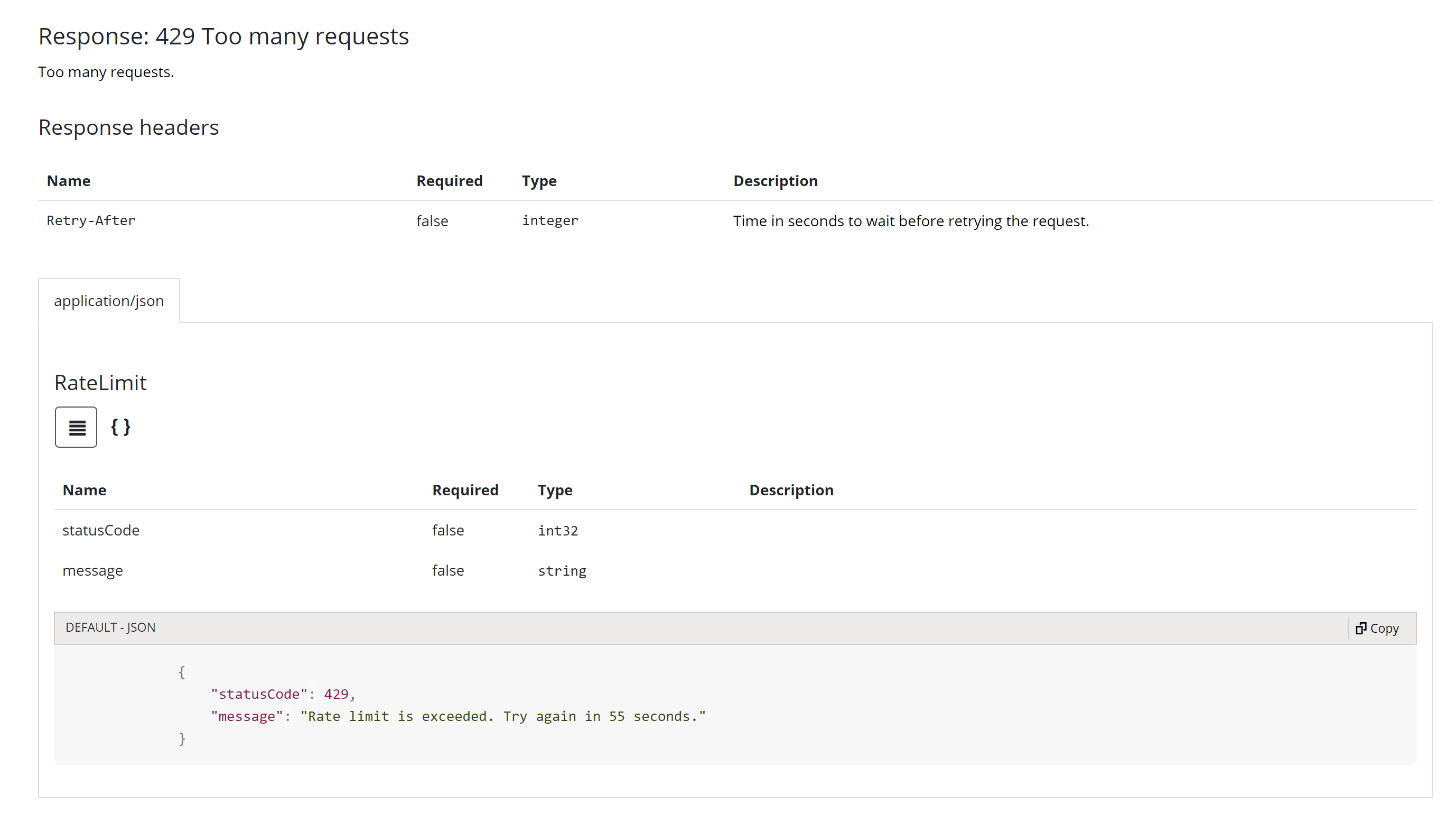 By default, Azure API Management returns a 429 (Too Many Requests) response when the rate limit is exceeded. It also includes a header with the number of seconds the client should wait before retrying. We can include this in the definition by adding a 429 status code response as shown below.